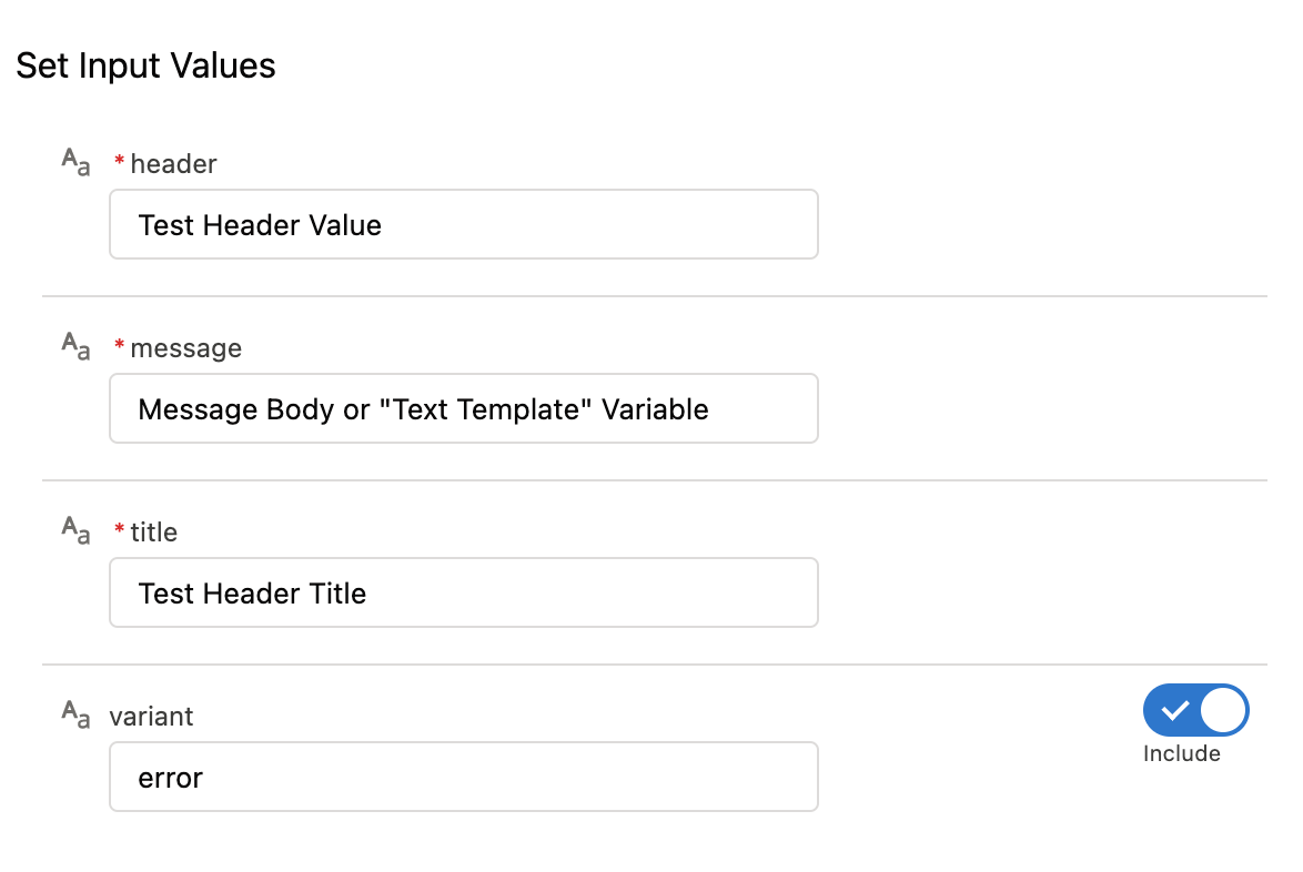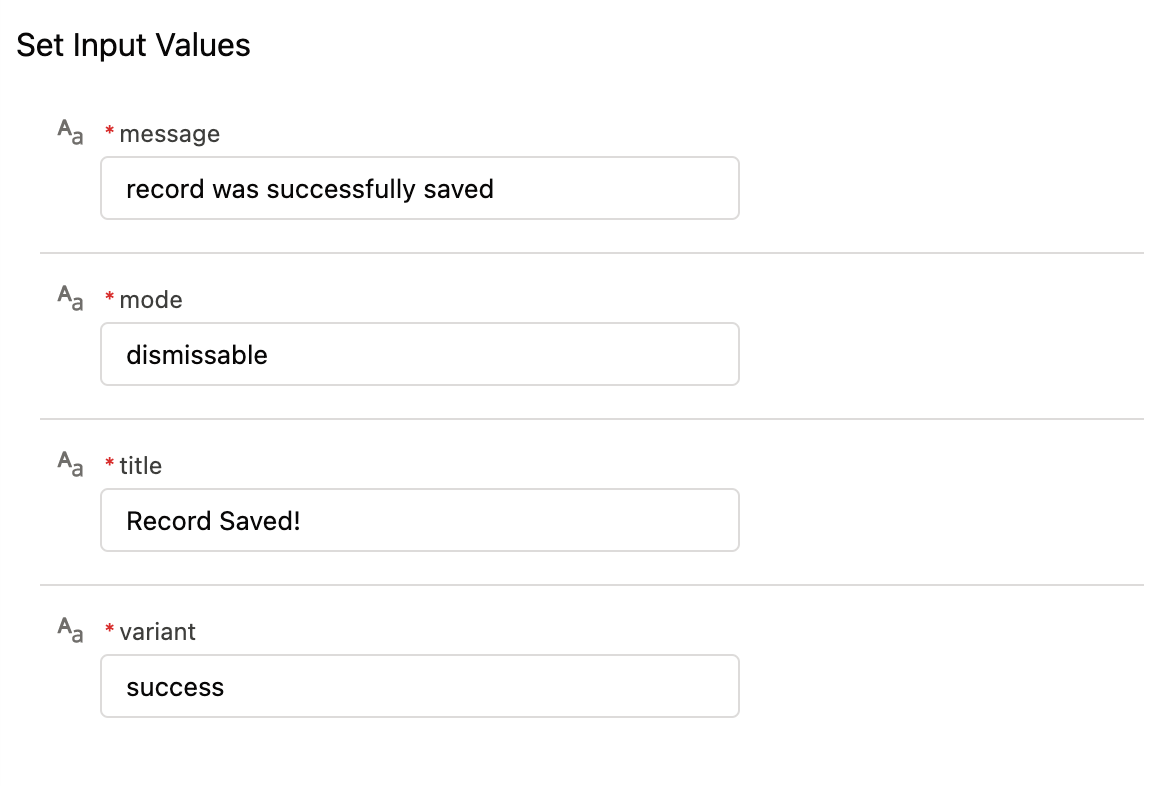 • Message: Assign a message value for the toast alert.